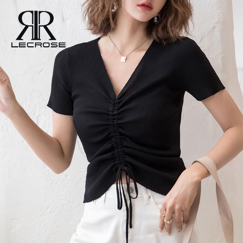 Kaos Kerah V : Kerah berbentuk ini menarik perhatian mata ke wajah dan membuat tubuh terlihat lebih panjang.